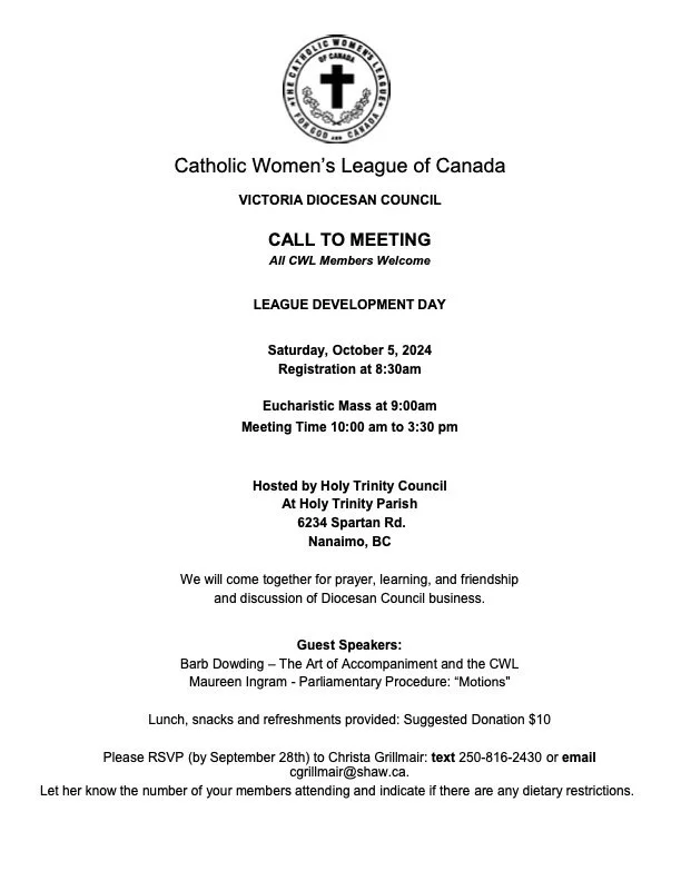 Hello, Everyone: We are having our League Development Day on Saturday, October 5, 2024 at Holy Trinity Church in Nanaimo, B.C. For those of you who are visiting this church for the first time, remember to drive around to the back of the building.